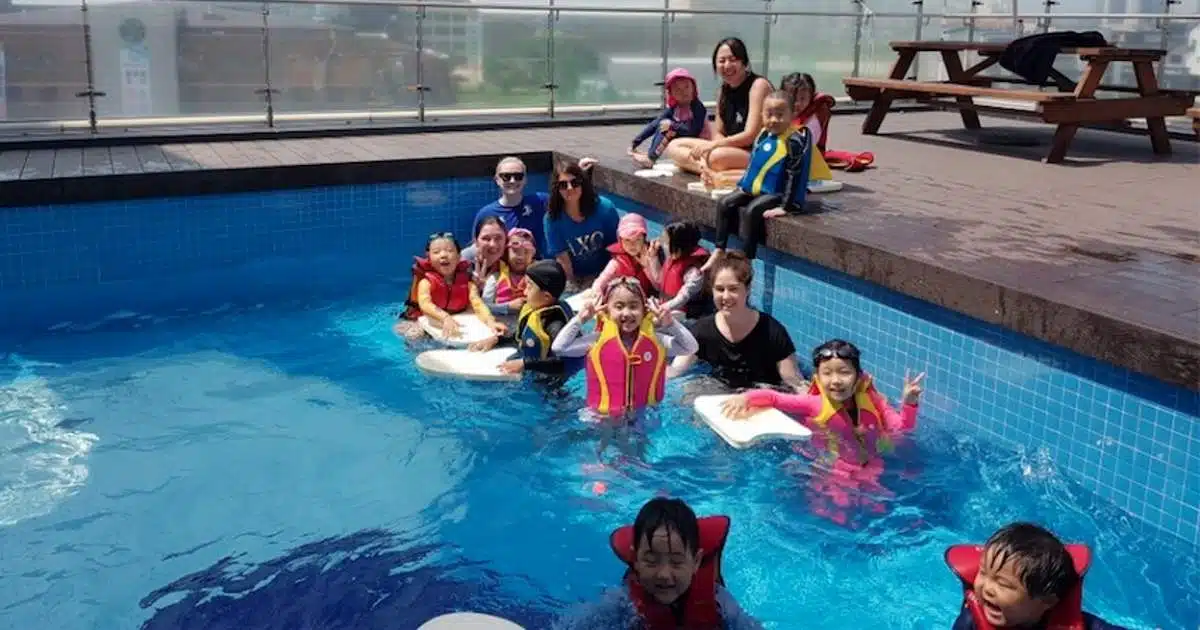 I would have to say that one of the best things as a new teacher to see is when you have a child who has been struggling a little with a word or pronunciation, tackle that word and do it with confidence and a smile. Kids need praise from adults with these victories, they need to know that they are doing great! Aside from that, getting to swim with the kiddos this last month during these hot days in Korea has been so much fun. They love kicking and splashing around in the water with their teachers and friends! So much joy comes from learning English in fun ways, having the kids tell us they are “swimming like fish.”
