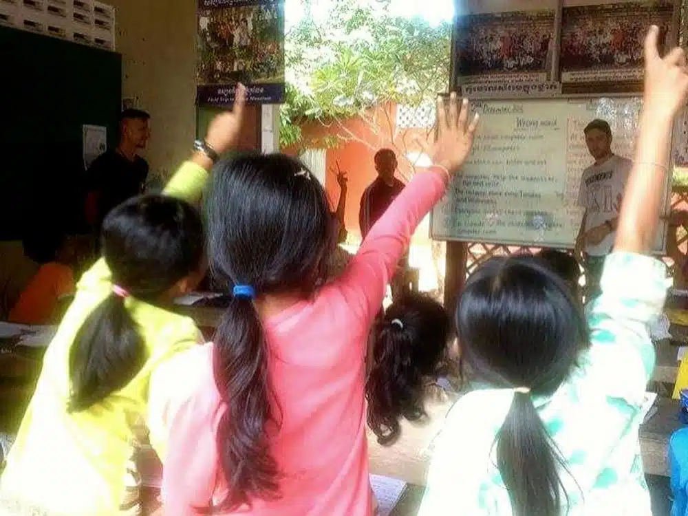 The school I was on my way to visit I had found online through the website Work Away.  When I arrived in Siem Reap which is the main city in Cambodia, I dubiously took a tuk-tuk on the 5km journey out of the city and into the suburbs of Cambodia. Arriving there, we turned off the main road and along a long dirt track towards a group of wooden shacks. I got the tuk-tuk driver to call the contact I had for the school. I then saw the headteacher in the distance and walked over. I said to him ‘Nice place you’ve got here, where is the school?’…He said, ‘this is it’.